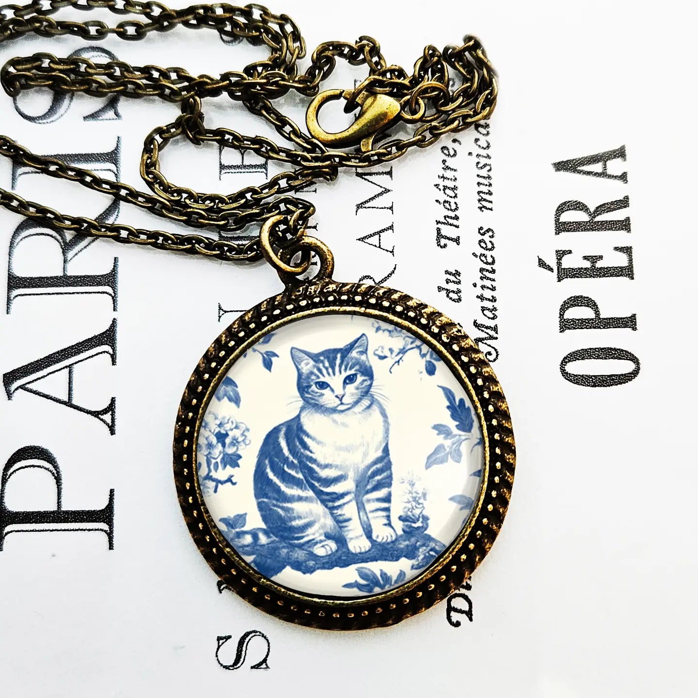 A charming mix of elegance and whimsy, this pendant necklace features a glass design of a chinoiserie-inspired cat. Set in a bronze bezel and paired with an 18-inch chain, it’s a sweet statement piece that’s perfect for cat lovers and boho-chic style fans alike.