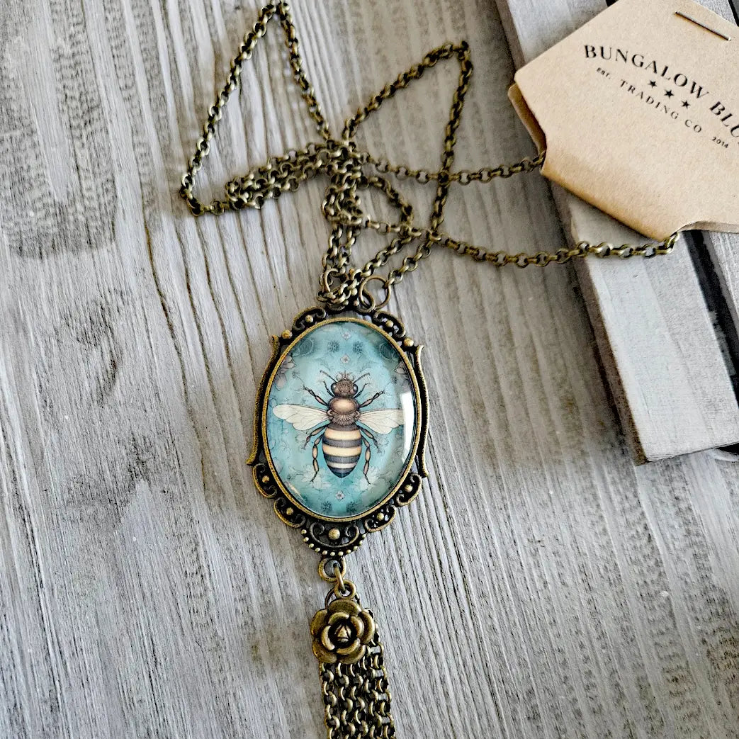 Sweet and whimsical, this tassel necklace features a detailed glass pendant with a bee design. Set in a bronze bezel and paired with a 24-inch chain, it’s accented with a tassel and rose charm for a touch of boho flair. Lightweight and eye-catching, it’s a perfect piece for layering or wearing on its own.