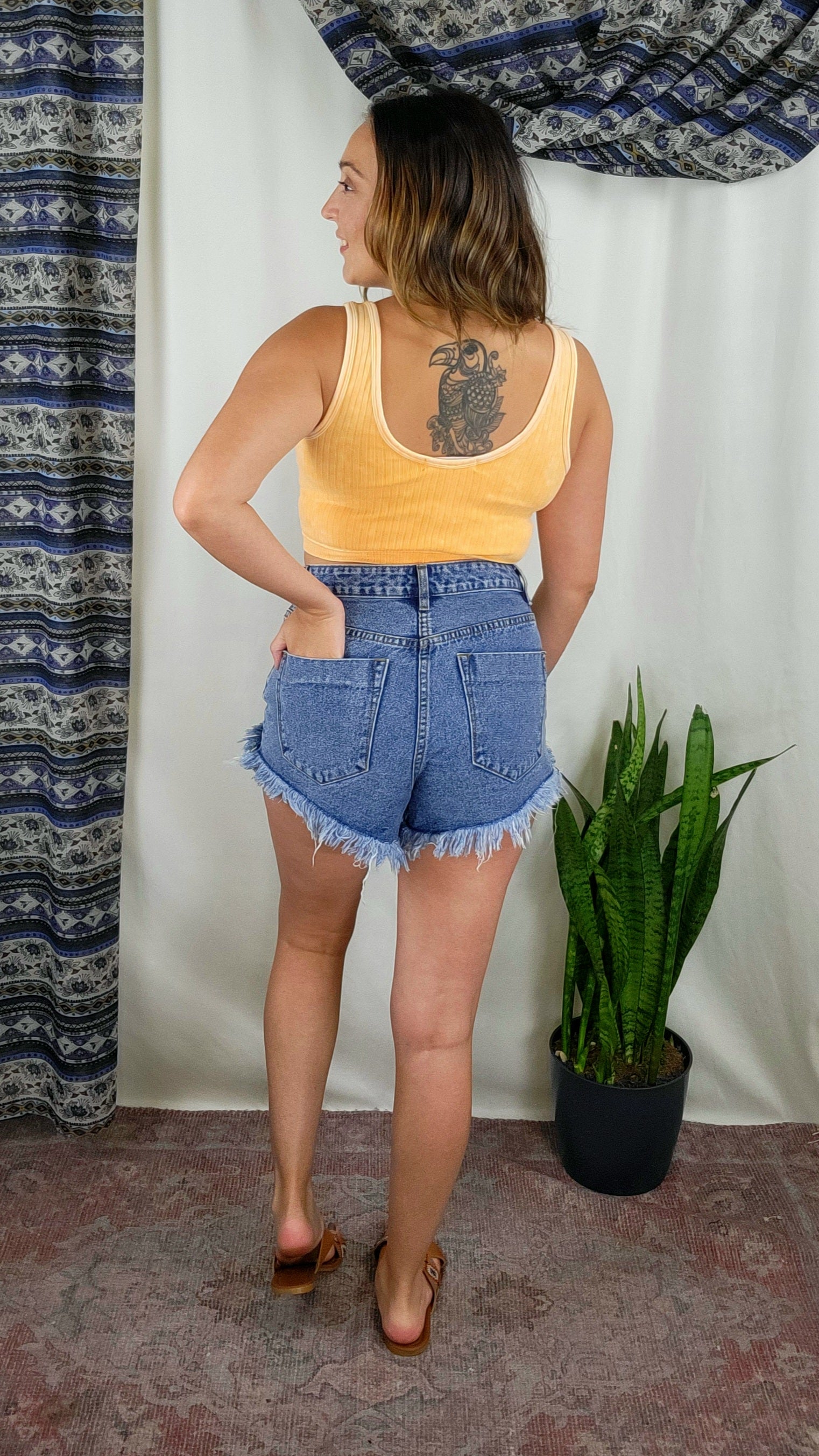 The high-waisted design adds a flattering touch to your silhouette, accentuating your waistline and elongating your legs for a stunning, confident look. The raw, frayed him gives these shorts a laid back, carefree vibe. Embrace the spirit of vintage fashion while staying on-trend with this versatile jean short. Pairs perfectly with our V-Neck Crop Top