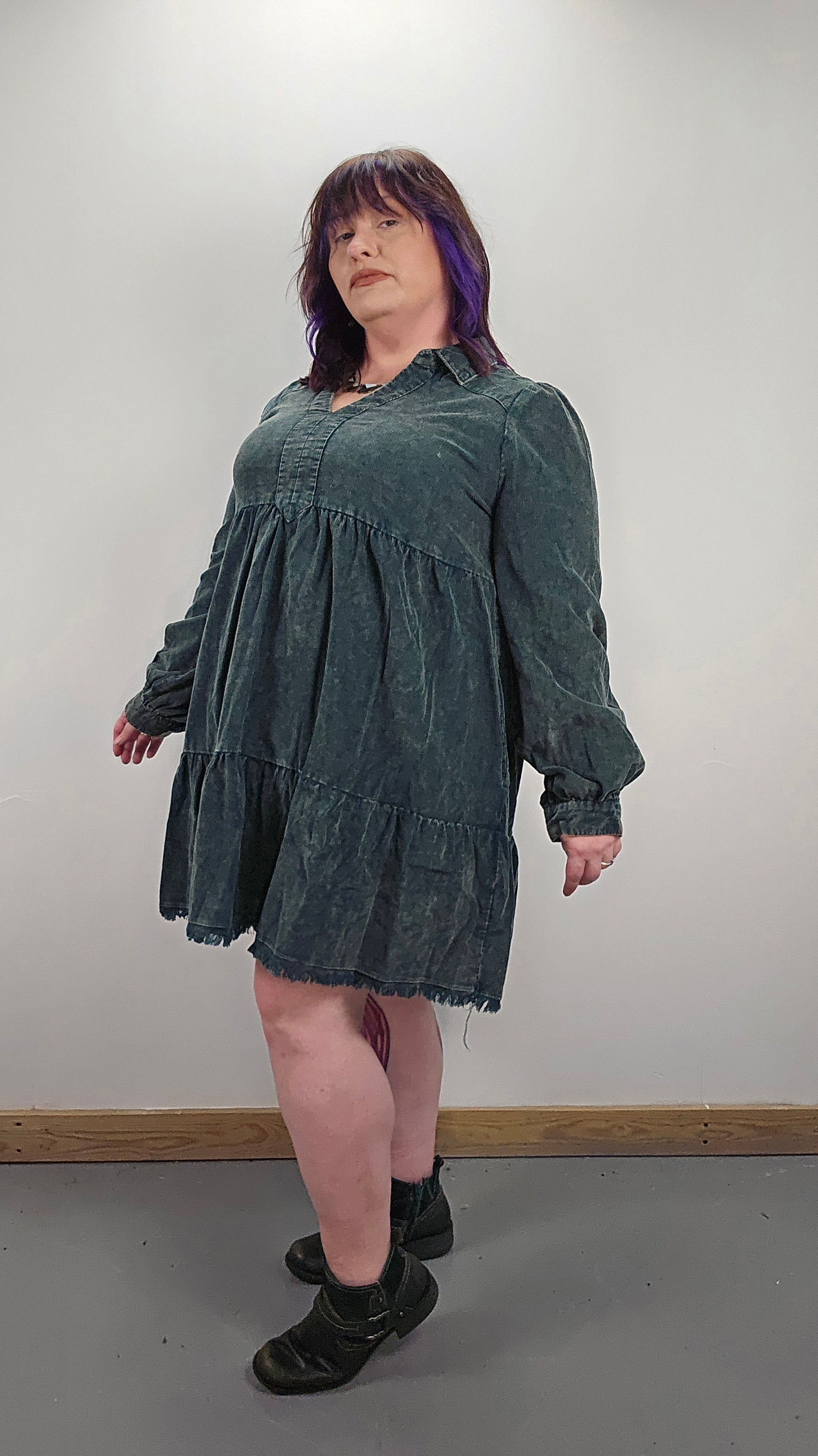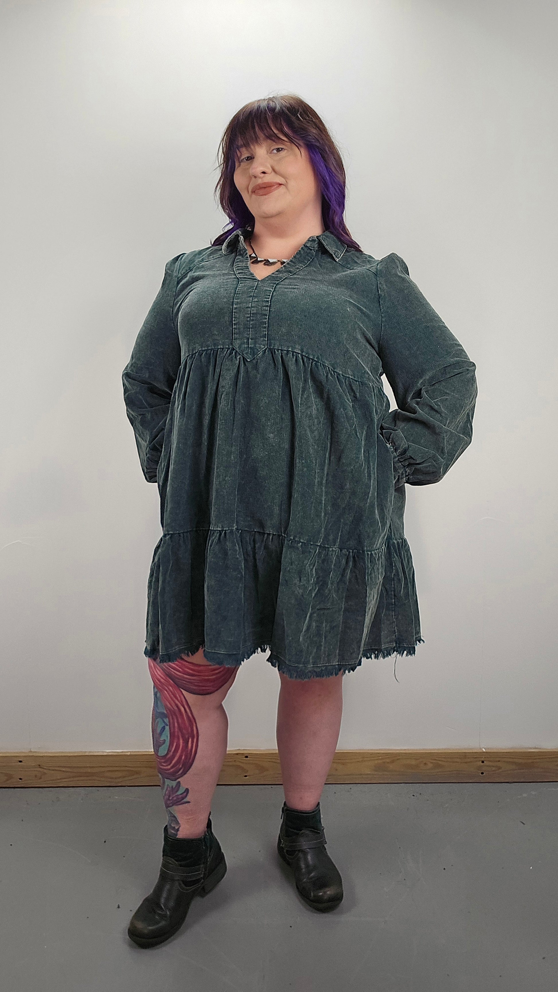 Mineral Wash Corduroy Tiered Dress – PLUS – A long-sleeve, collared corduroy dress with a V-neckline and tiered silhouette that hits just above the knee. Crafted from 100% cotton with a mineral wash finish for a vintage-inspired look. Features side pockets and fringe detailing for subtle boho attitude. Perfect paired with your favorite boots for a fall-ready, chic outfit.