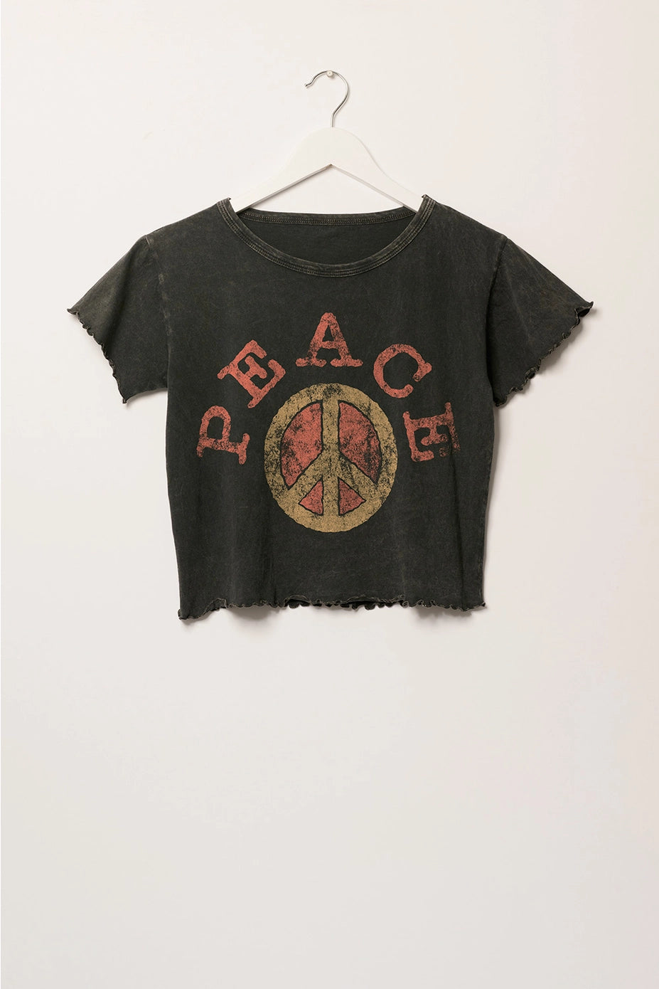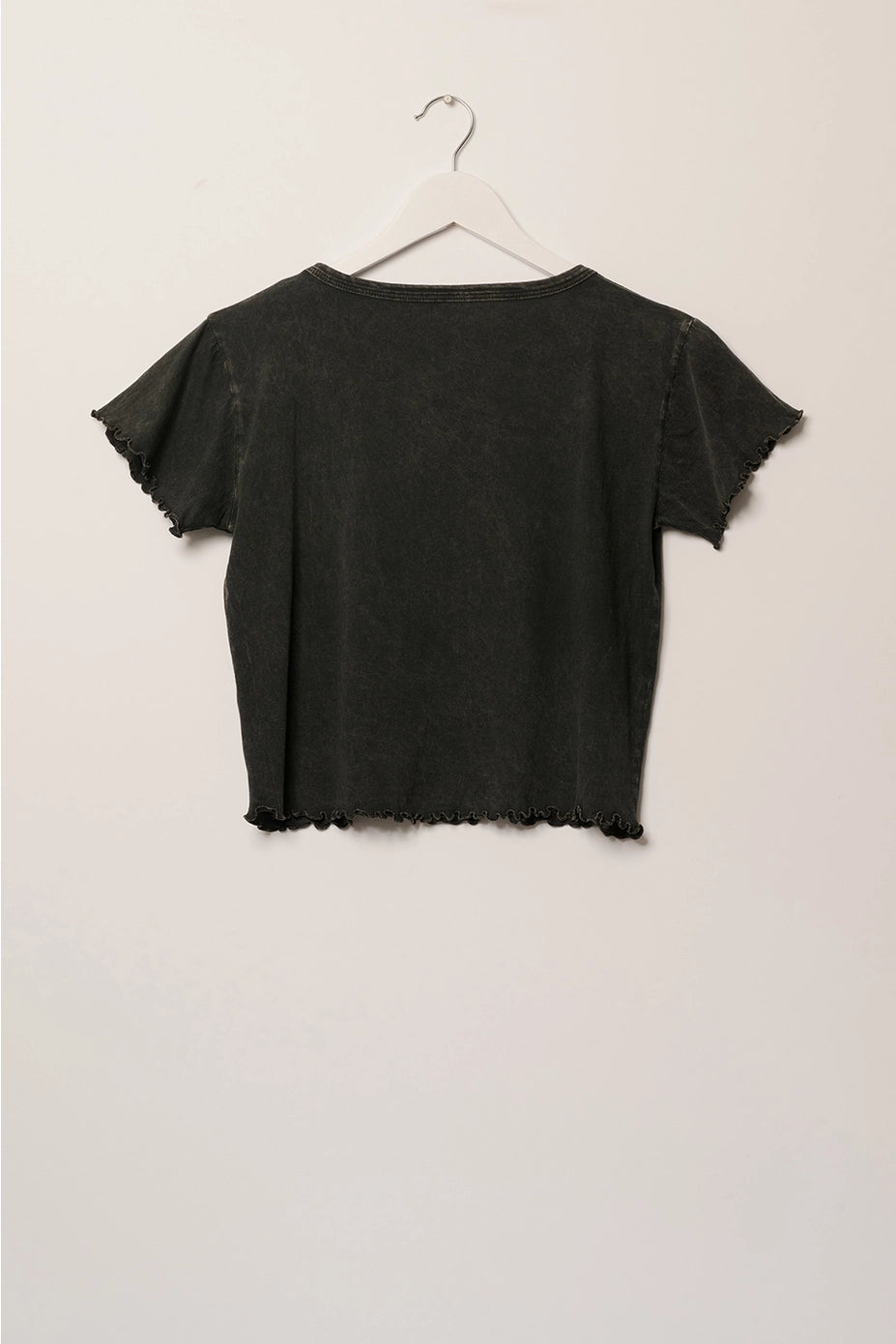 Give your outfit a dose of vintage charm with this mineral-wash tee. Soft 100% cotton, a relaxed fit, and dropped shoulders keep it comfy, while the lettuce-edge sleeves and hem add a playful, boho touch. Perfect for pairing with your favorite jeans or cutoffs.