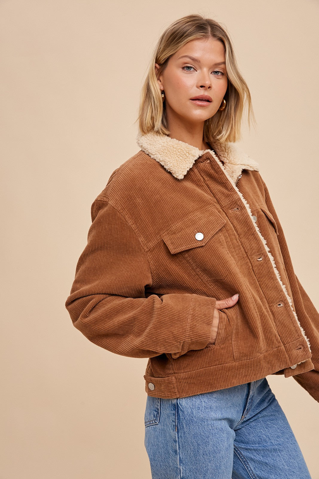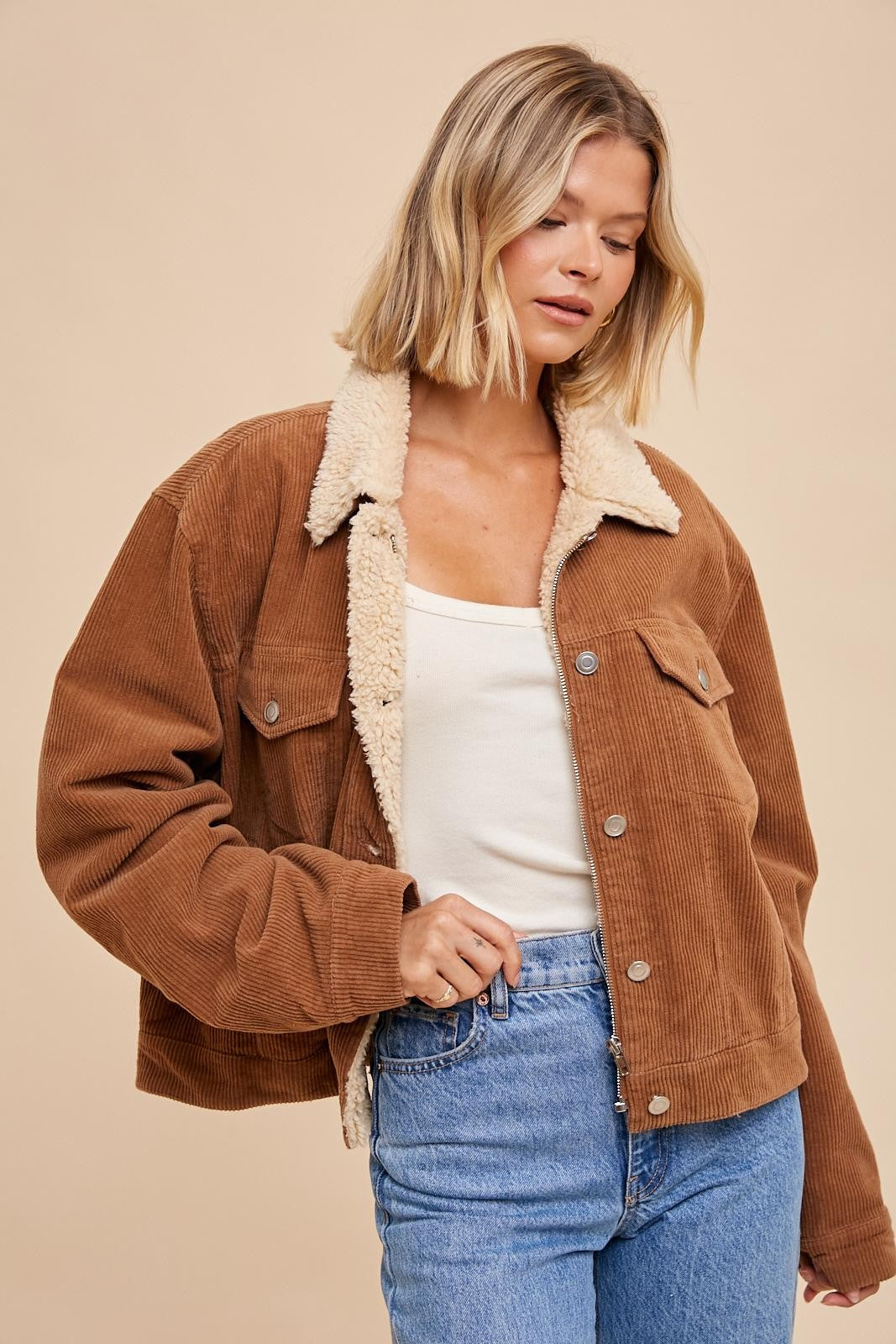 Introducing our Camel Corduroy Jacket, a stylish and cozy addition to your winter wardrobe. With a plush shearling lining, double-breasted pockets featuring metal buttons, and convenient side pockets, this jacket seamlessly blends comfort with fashion. The full zipper closure adds a modern touch to the classic design. Crafted from a durable blend of 100% cotton and 25% viscose, with a contrasting 100% polyester lining, this jacket offers both warmth and style. In a timeless camel color, it's the perfect outerwear piece.
