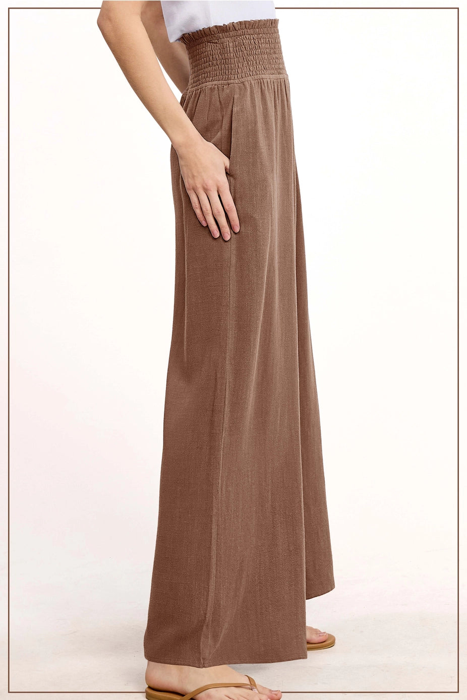 Crafted from a breezy 70% viscose, 30% linen blend, these high-waist pants feature a smocked waistband for all-day comfort, a flattering wide-leg cut, and side pockets for practicality. Lightweight and versatile, they’re perfect for casual days, lounging, or elevating your boho look.